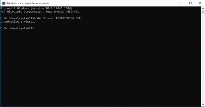 - Puis à nouveau désactiver le mode test avec bcdedit :